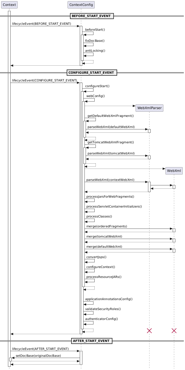 Diagram 7 shows how the ContextConfig component responds to lifecycle events triggered by the Context to parse the global and application provided configuration files to create a merged web.xml file that is then used, along with other settings, to configure the web application.